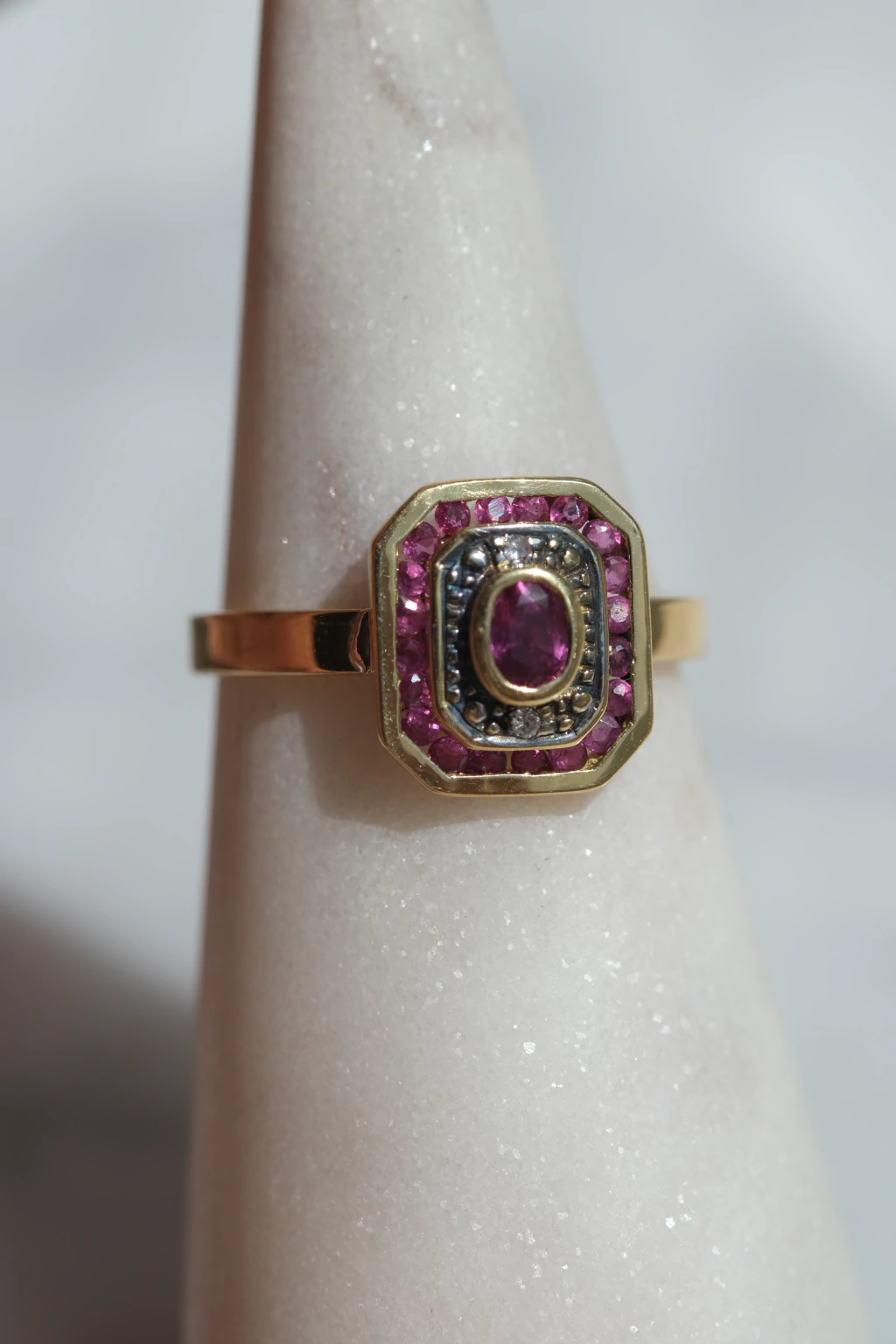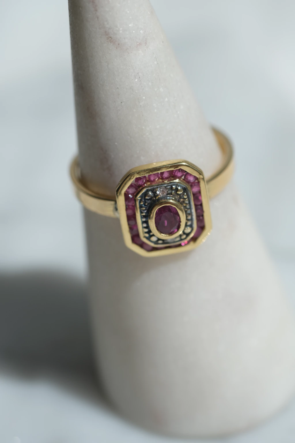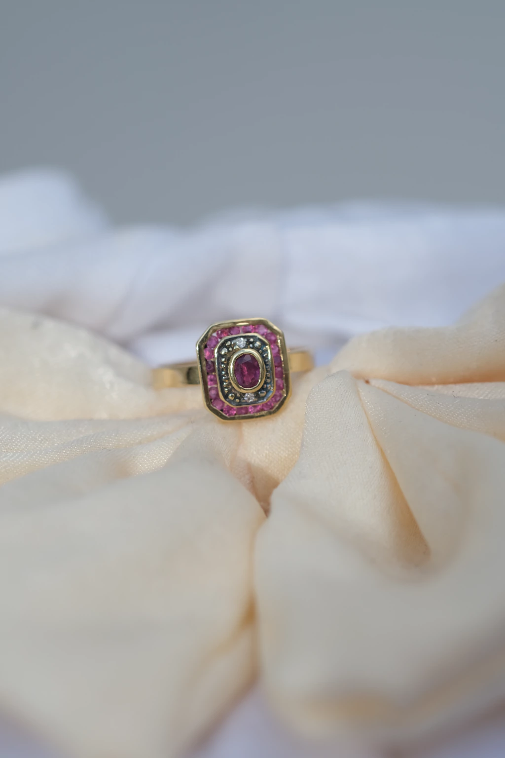 Anillo único con broche antiguo de oro 18k con rubíes de estilo Art Déco.