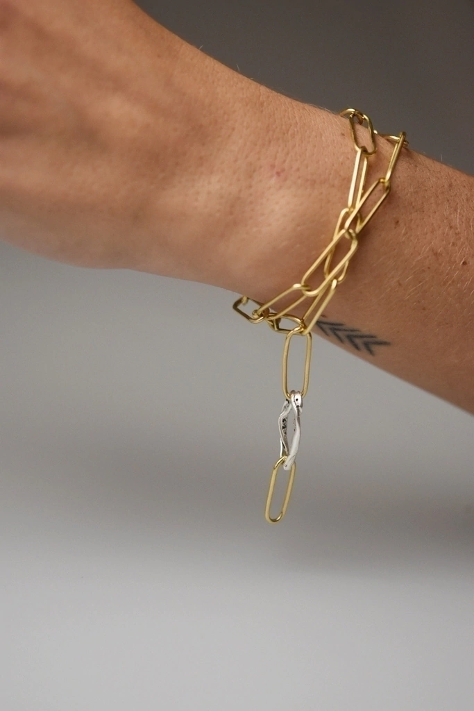 Collar de Bronce enchapado en oro o en Plata y un eslabón de Plata 925, engarzado con cristales Swarovski.
